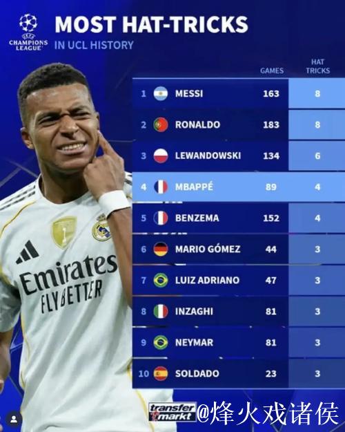 欧冠改制后戴帽次数排行:梅西、C罗并列第1,共8次进入前十